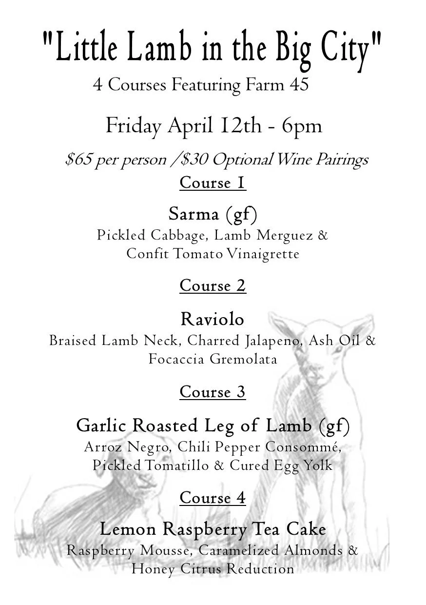 Dine in 5pm - 9pm & Farm 45 Dinner 6pm Friday, April 12, 2024 5:00 PM 9:00 PM 17:00 21:00 Google Calendar ICS To purchase tickets to this special event - please visit:https://www.braiselocalfood.com/farm-dinners/littlelambbigcity