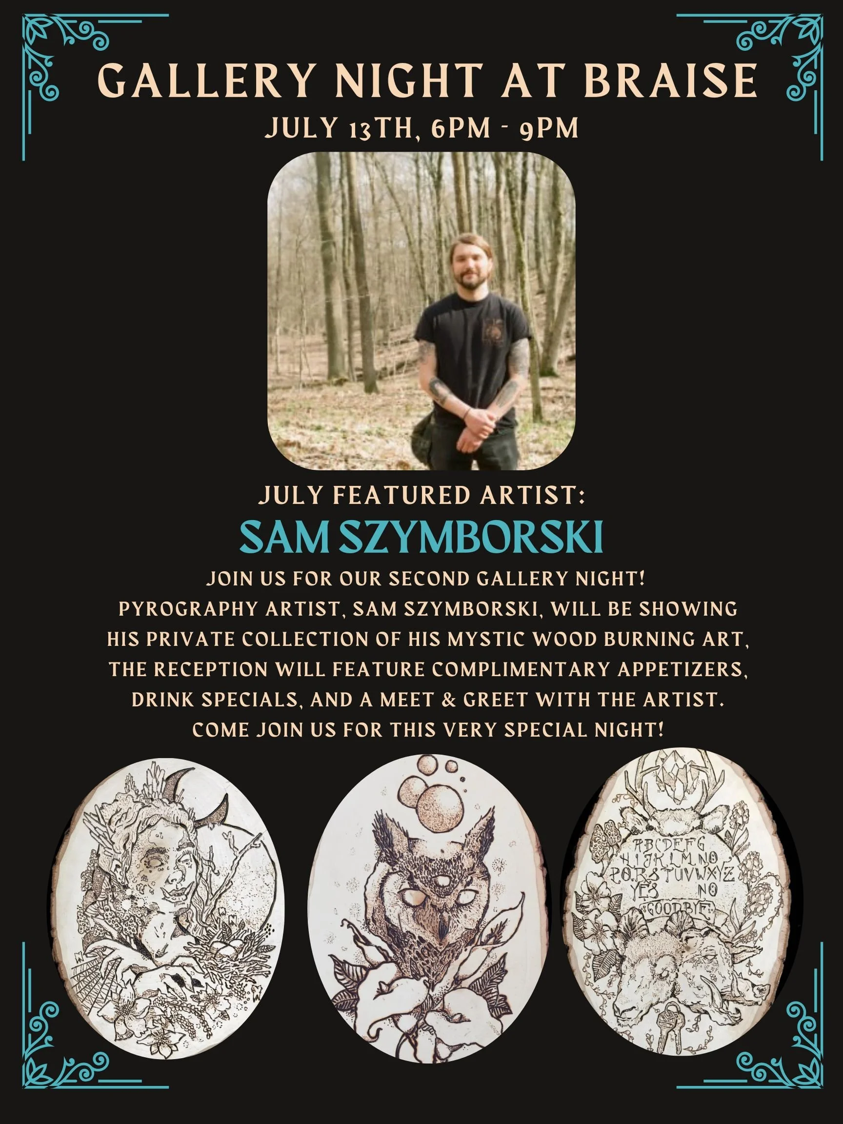 Local Milwaukee pyrography artist, Sam Szymborski, will be our artist for July. He will be showing a private collection of mystic wood burning art.